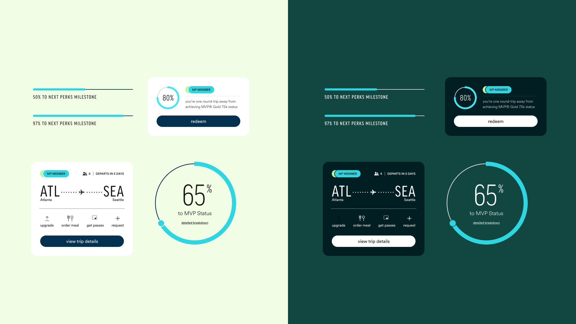 By the end of the engagement, we delivered a comprehensive design system that unified brand, UX, and UI. This included a reimagined color strategy for promotions, loyalty tiers, and light and dark modes, a new tiered system for loyalty earnings and rewards, and reimagined pathways for interactions across accounts and day of travel flows.